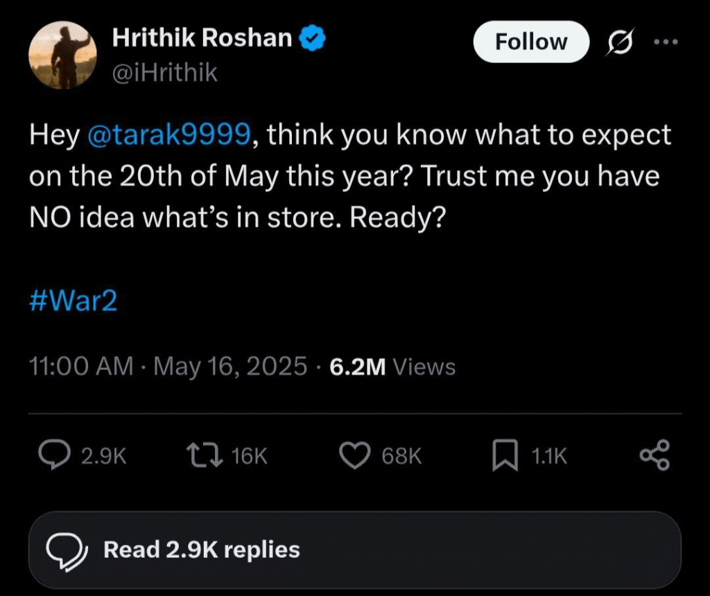 “Hey @jrntr, think you know what to expect on the 20th of May? Trust me, you have NO idea what’s in store. Ready? #War2”
